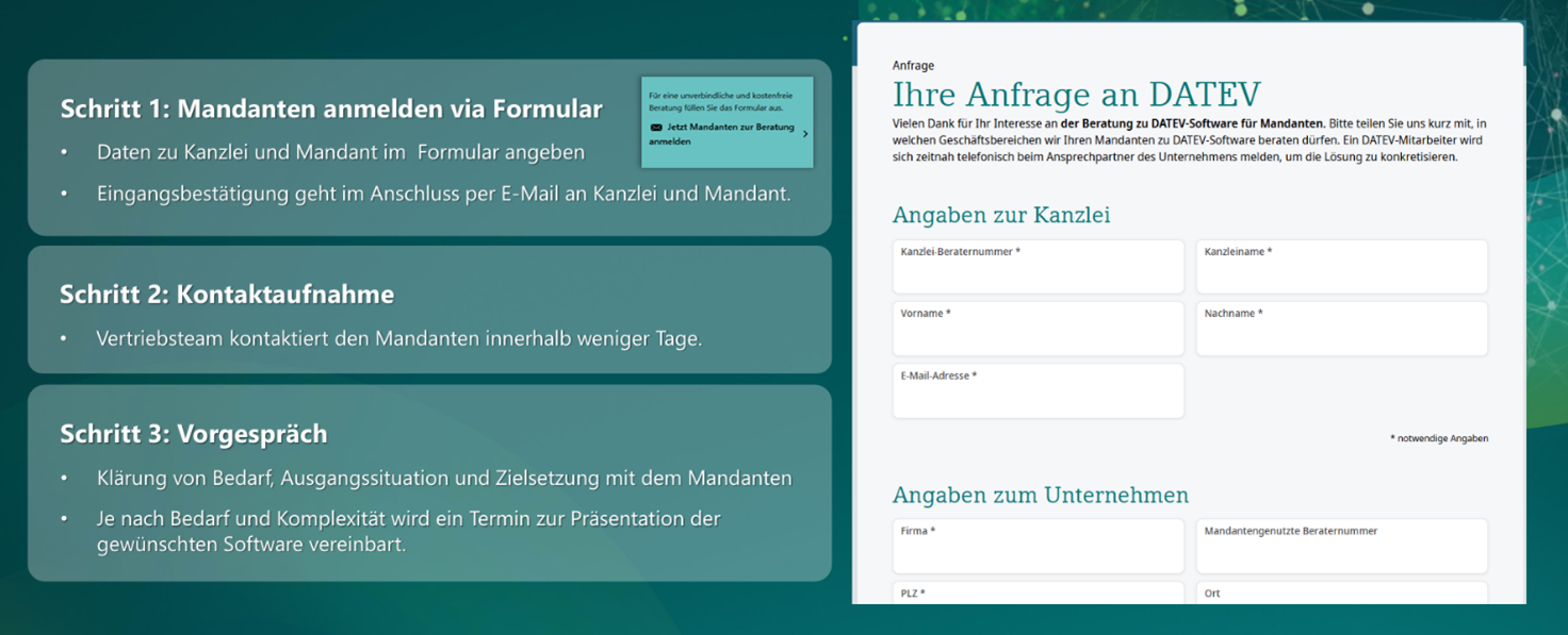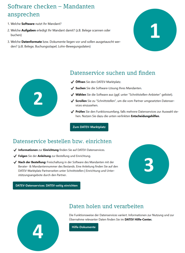 Die gute Nachricht und Lösung: Sie müssen das nicht allein stemmen. DATEV unterstützt Sie und Ihre Mandanten ganzheitlich – mit der DATEV Software-Beratung für Mandanten – kostenlos, professionell, verbindend. Ihre Mandanten erhalten eine umfassende Prozess- und Softwareberatung für Lohn- und Finanzbuchführung – auf Wunsch inklusive IT-Outsourcing.