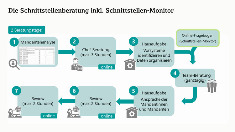 Gemeinsam mit Ihrem DATEV-Berater planen Sie den Einsatz und die Nutzung der Schnittstellen, um die Arbeitsprozesse in der Zusammenarbeit mit Ihren Mandanten zu verbessern.