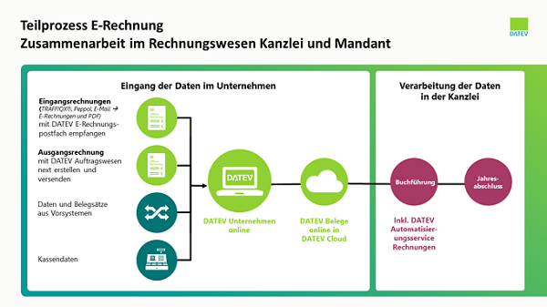 - Durch die Anbindung des DATEV E-Rechnungspostfachs ist eine automatisierte Übergabe der eingegangenen Rechnungen an Belege online (DATEV Unternehmen online) möglich. Ihre Mandantinnen und Mandanten könne die empfangenen E-Rechnungen direkt in DATEV Unternehmen online weiterverarbeiten.