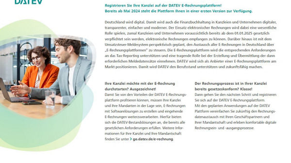 Der Austausch von Rechnungsdaten soll laut Plänen des Bundesfinanzministeriums künftig über Plattformen erfolgen. Da die Umsetzung rechtlicher Vorgaben zu den zentralen Tätigkeiten der DATEV zählt, wird die Genossenschaft eine eigene E-Rechnungsplattform anbieten.