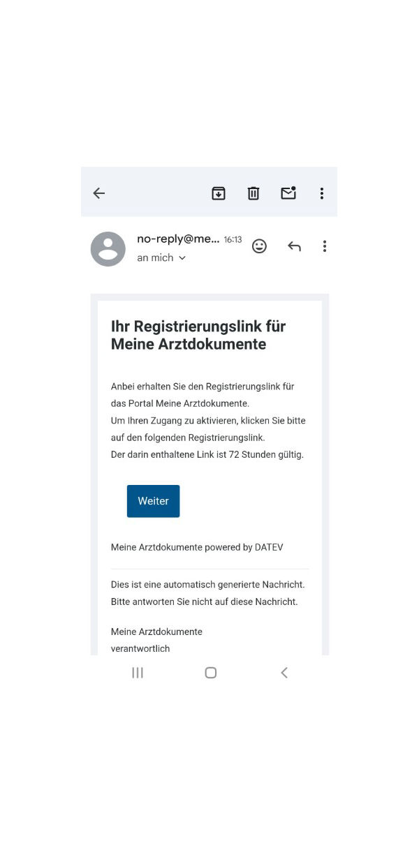 Klicken Sie auf den Link in der E-Mail, welche Sie vom Absender no-reply@meine-arztdokumente.de erhalten haben, um Ihr Konto zu aktivieren.