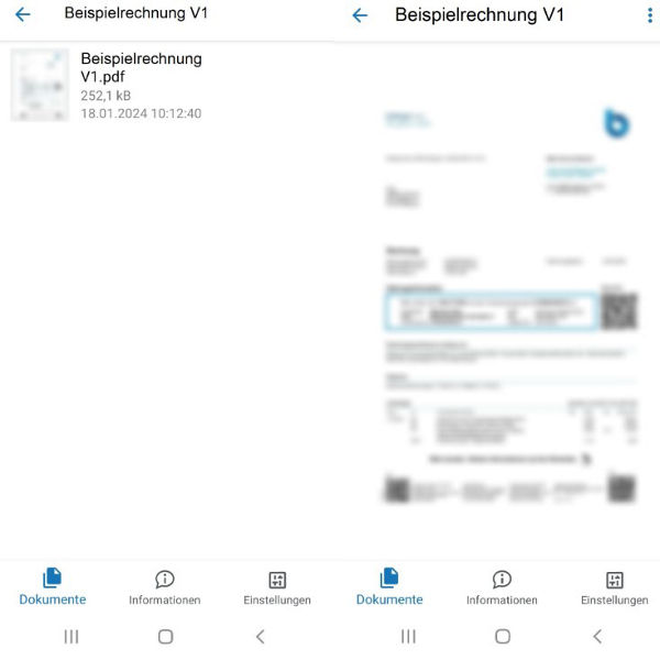 Bitte den QR-Code Ihrer Rechnung mit der App einscannen. Möglicherweise müssen Sie der App noch die nötigen Berechtigungen erteilen, damit diese auf die Kamera Ihres Smartphones zugreifen kann.