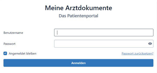 Geben Sie auf meine-arztdokumente.de Ihren Benutzernamen sowie Ihr Passwort ein.