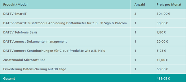 Die Kalkulation im Beispiel beinhaltet DATEV-SmartIT-Zugang, Telefonie-Lösung, Lösung für Digitale Signatur, Lösung für Finanzreports, Bereitstellung Microsoft 365 sowie Datensicherung auf 30 Tage. Grundlage der Kalkulation ist die aktuelle Preisliste August 2024. Zusätzlich fallen Lizenzkosten für Drittanbieterlösungen wie Microsoft, FP Sign etc. an. Bitte beachten: DATEV ist nicht Lizenzgeber – Lizenzen sind direkt über den Hersteller zu beziehen. Ggf. anfallende Lizenz-Kosten werden demnach nicht über DATEV berechnet.