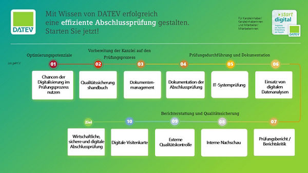 Für eine effiziente Abschlussprüfung empfehlen wir Ihnen einen strukturierten Entwicklungspfad mit neun Schritten. Er führt Sie durch verschiedene Lern- und Beratungsmodule und begleitet Sie gezielt bei der Einführung.